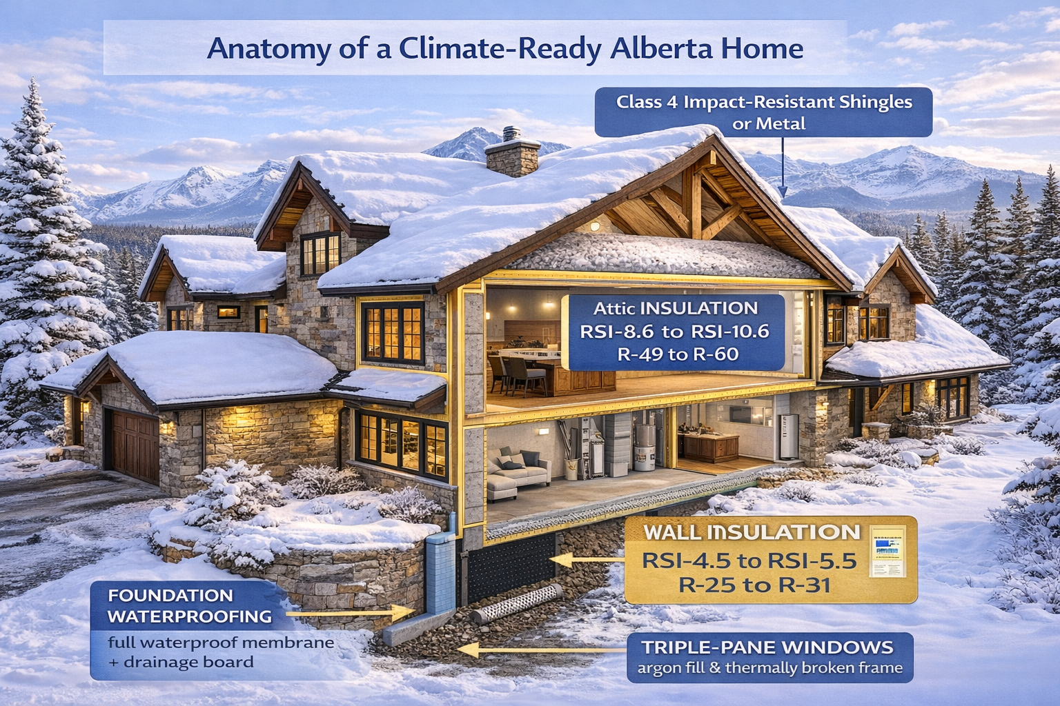 - Alberta's climate demands insulation values, foundation depths, and roofing materials that exceed standard Canadian building minimums.