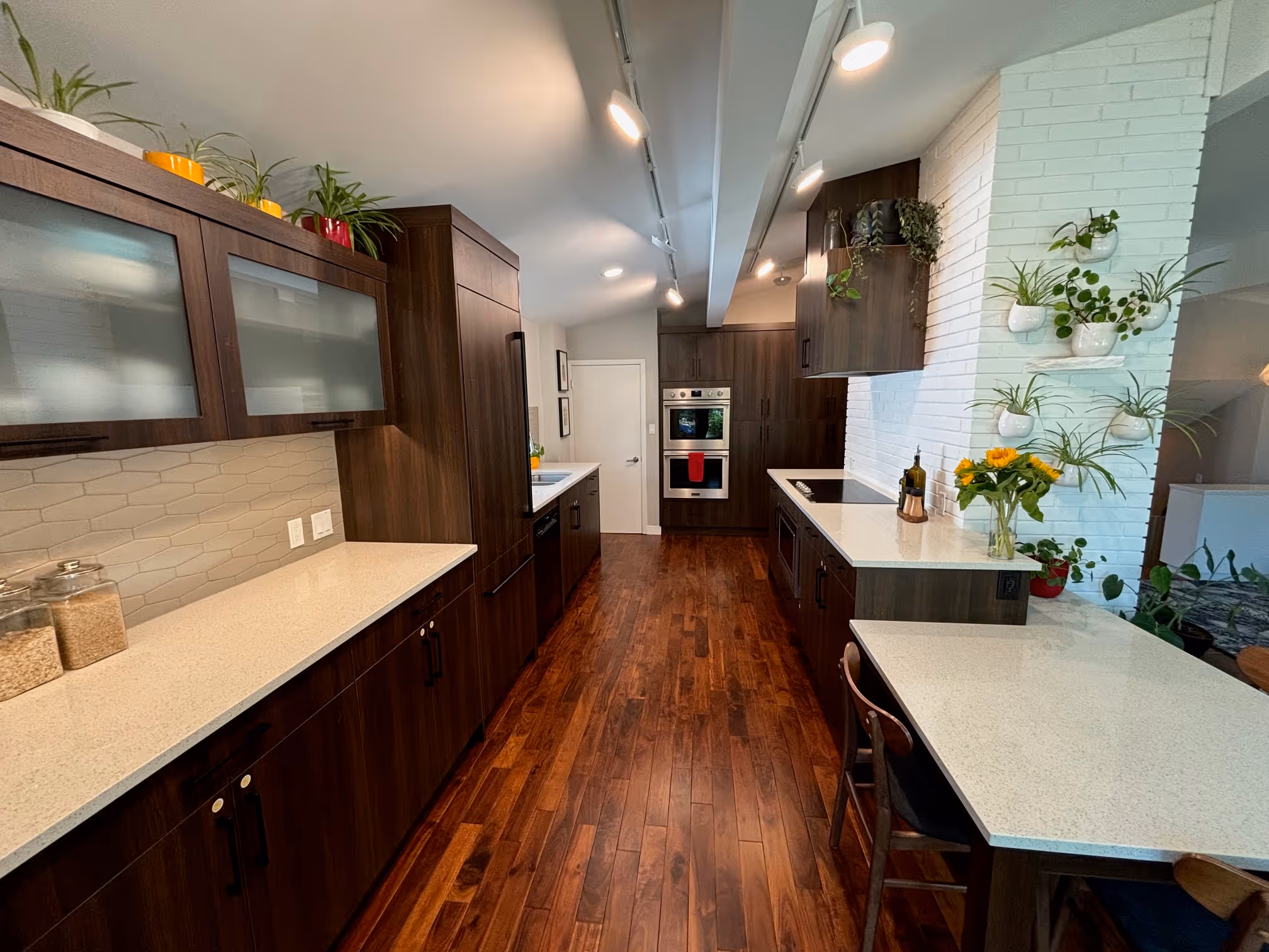 Ample storage maximizes counter space, while a bonus seating area encourages those after-school convo’s during dinner prep.