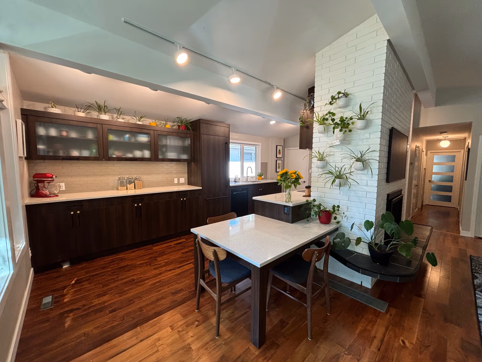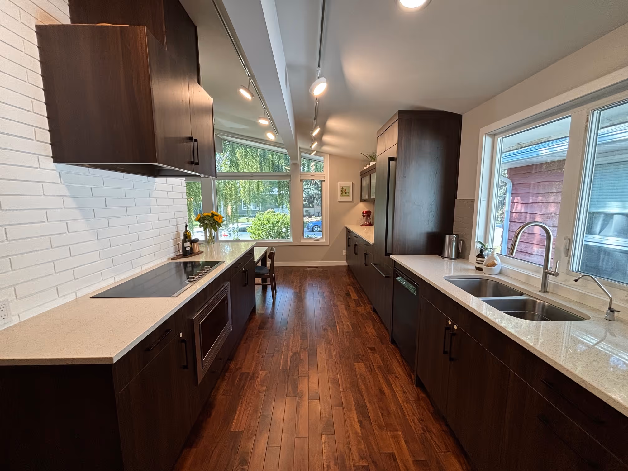 Contrasting natural light with dark wood cabinetry and flooring gives this renovation a dramatic and inviting style. Storage grows smarter, prep feels easier, and the room invites slow breakfasts and long conversations without losing its country comfort.
