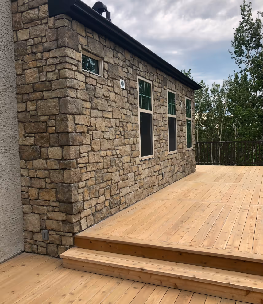 Wood and stone above the garage invite coffee, talks, and starry summer nights.